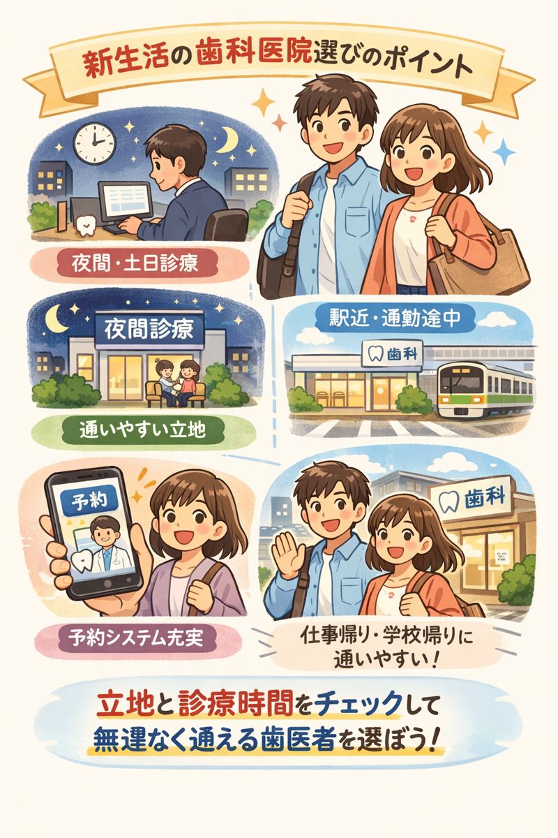 新生活をスタートする際に、歯科医院選びにおいて後悔しないためには、「立地と診療時間」のバランスを重視することが不可欠です。